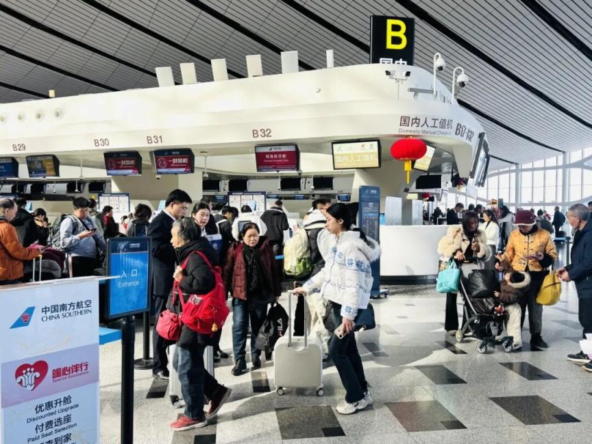 在大兴机场四层南航值机柜台,旅客们正在排队值机。不同于往年的春节假期,返程高峰出京的旅客有一定增加。韩女士来机场送父母回哈尔滨,她为老人们预订了“无陪老人”的相关服务。“提前2小时办理‘无陪老人’服务的手续,老人没怎么坐过飞机,会有专门的地服人员带着和指导,上飞机也会有乘务人员照顾,下飞机也会有人接,更放心一些。”