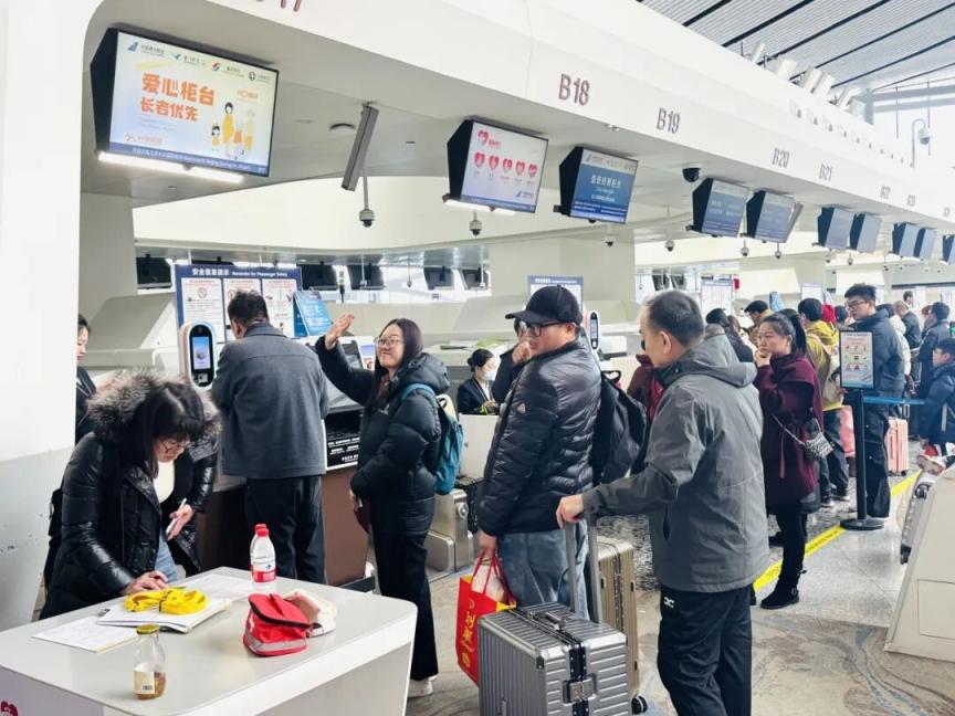 吕萌奇介绍,春运期间,团队出行涨幅明显,三亚、昆明、伦敦等是家庭旅客、研学团出行的热门选择,国内、国际值机区域设置团队服务专柜,有序引导旅客分区办理,专人对接旅行社及导游团队。另外,春节假期,宠物保障数量明显增加。南航在值机环节设专属柜台,工作人员理手续并为宠物打印萌趣登机牌。值机后协调绿色安检通道,登机前预约摆渡车并安排优先登机,也有特服人员全程协助安置、解答疑问,安抚宠物情绪。登机后协助固定宠物箱、安装防护套,介绍客舱设施与应急方法。