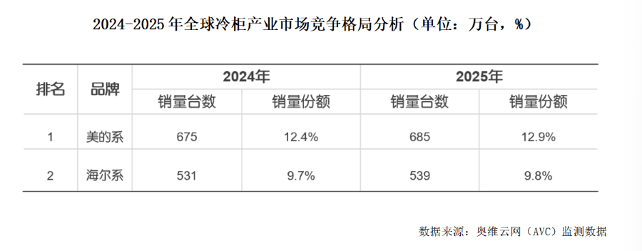 据奥维云网发布的《2025年中国冷柜产业市场现状与趋势洞察白皮书》(以下简称“白皮书”)报告,2025年全球冷柜市场保持稳健增长,整体销售规模达5517万台,同比增长1.19%。其中,美的系冷柜市场表现尤为突出,2024年美的系冷柜销量达675万台;2025年销量攀升至685万台,市场份额高达12.9%,已连续两年蝉联全球冷柜销量冠军,持续稳固行业市场龙头地位。
